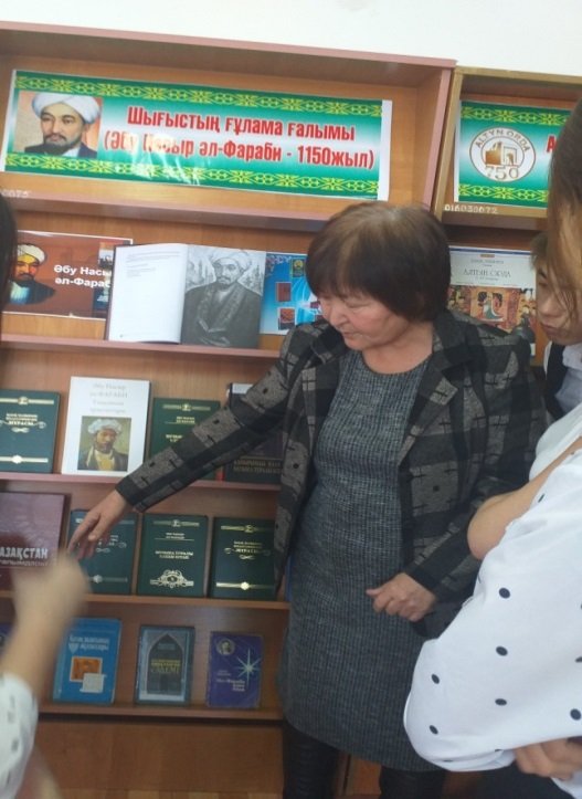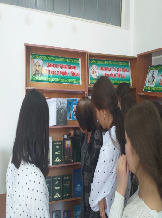 Шығыстың ғұлама ойшылы, математик, астролог, музыка теоретигі, Аристотельден кейінгі екінші ұстаз атанған Әбу Насыр әл-Фарабидің 1150 жылдық мерейтойына орай №3 кітапханада" Шығыстың ғұлама ғалымы " атты кітап көрмесі ұйымдастырылып кітапхана оқырмандарына кеңінен таныстырылды. Кітап көрмесіне Әбу Насыр Әл-Фарабидың он томдық шығармалары, «Таңдамалы трактаттар», «Қайырымды қала », «Музыка туралы кітап», атты әлеуметтік-этикалық трактаттарымен қатар А.Машановтың Әл Әл-Фараби және Абай, Ә.Дербісәлиевтің «Қазақ даласының жұлдыздары», А.Көбесовтің «Әл-Фарабидің ашылмаған әлемі» тағы да басқа шығармалары қойылып, оқырмандарға таныстырылды.