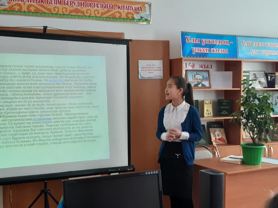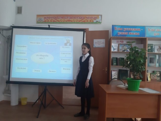 Халқымызға білімнің, ілімнің нәрін сепкен аса ірі тұлға Әбунасыр әл-Фараби мұраларынан нәр ағызып, жас оқырмандарды туған жерге деген сүйіспеншілікке, адамгершілікке, қасиетті нәрселерді қадір тұтуға тәрбиелеу мақсатында әдеби танымдық кеш өткізілді.